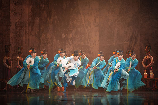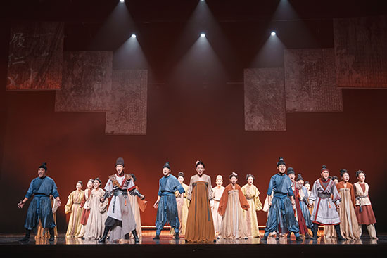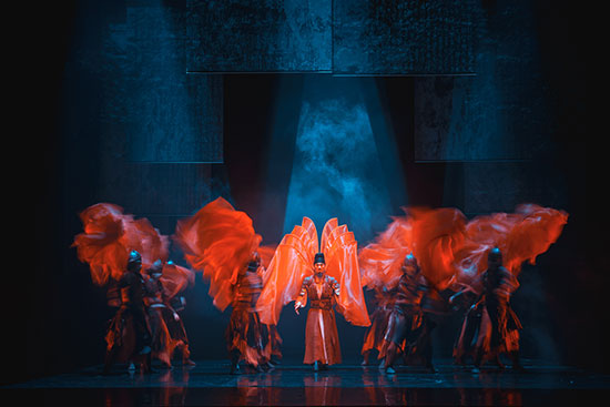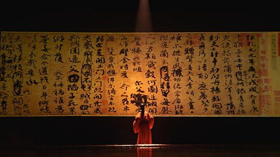 《祭侄文稿》是颜真卿创作的行书纸本书法作品,被誉为“天下第二行书”,具有极高的史料价值和艺术价值。舞剧将《祭侄文稿》的内容和颜真卿生平相互交织,通过颜真卿为侄儿撰写祭文时的回忆,串联起他的人生境遇。同时,借“堂”“宴”“关”之意象,将历史背景、人物情感、故事推进以写意叙事的方式,融合在舞台呈现当中。