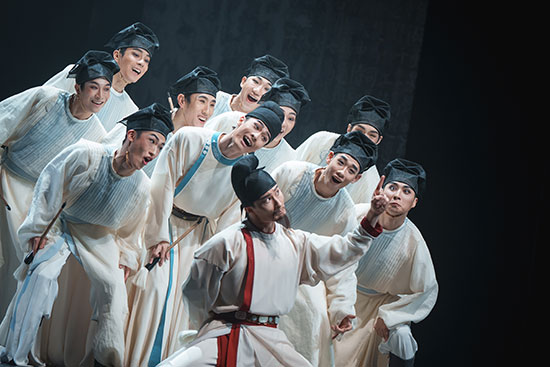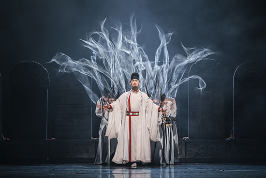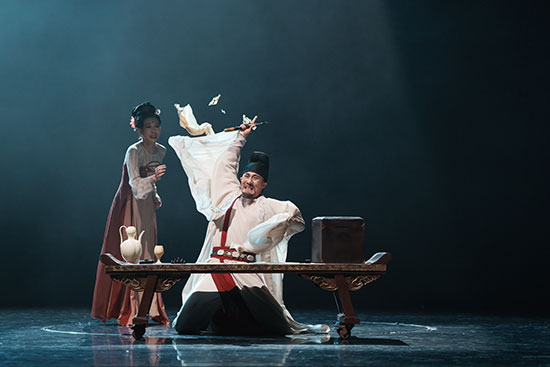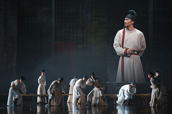 从“陋室提笔”到“碑林绝笔”,舞剧层层铺陈颜真卿的人生故事,将他“真卿”“清臣”中承载的士大夫精神立体丰满的呈现在舞台上;从克制隐忍到悲怆决堤,舞剧渐渐揭示颜真卿的情感变化,既展现祭文中“心手合一”的笔势墨韵,更体现文稿背后“锥心刻骨”的精神内核。全剧将颜氏一族的家国情怀贯穿始终,更将颜真卿的精神境界凝聚升华。