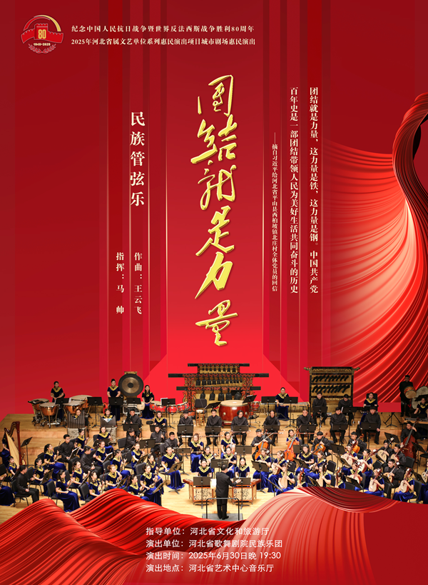 为庆祝中国共产党成立104周年暨中国人民抗日战争暨世界反法西斯战争胜利80周年,原创大型民族管弦乐组曲《团结就是力量》主题音乐会将于2025年6月30日19:30在河北省艺术中心音乐厅隆重上演。音乐会旨在奏响团结主旋律,向抗战英烈、世界反法西斯英雄以及中国共产党的光辉历程和伟大成就致敬。