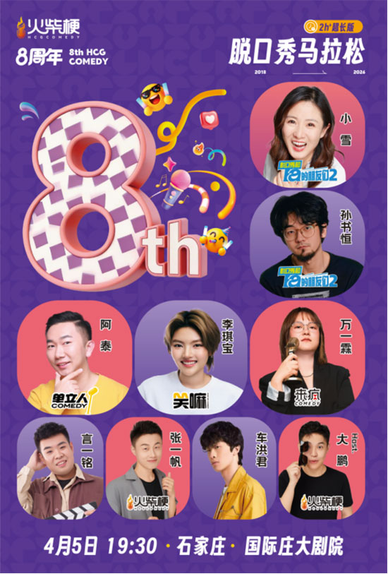 《火柴梗8周年喜剧马拉松》是火柴梗喜剧8周年的纪念演出,在河北石家庄从事喜剧事业8年了,给石家庄观众带来一场喜剧盛宴,主打看个够!演出总时长2小时起步,演出阵容也邀请了综艺节目《脱口秀和Ta的朋友们》的明星孙书恒和小雪,以及单立人喜剧的阿泰,笑嘛喜剧的李琪宝,来疯喜剧的万一霖,复旦大学的车洪君,东北演员言一铭以及火柴梗签约演员张一帆。主持人是火柴梗创始人大鹏。