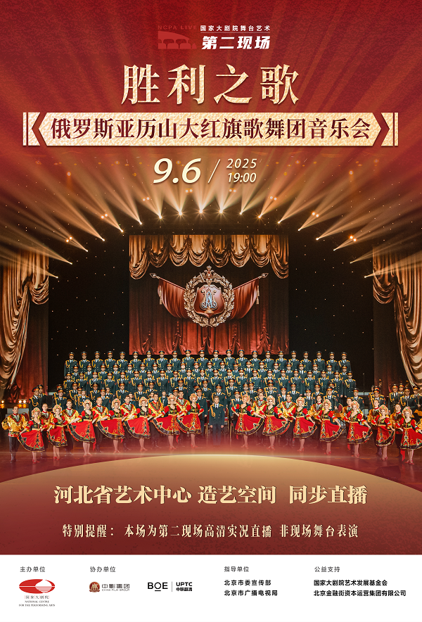 9月6日19:00,国家大剧院舞台艺术“第二现场”,俄罗斯亚历山大红旗歌舞团“胜利之歌”音乐会在国家大剧院歌剧院的现场演出实况将在全国各地的上百家剧院、影院银幕上同步直播。