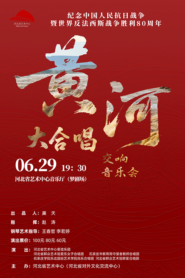 为纪念中国人民抗日战争暨世界反法西斯战争胜利80周年,河北省艺术中心将于2025年6月29日隆重推出《黄河大合唱》交响音乐会。
