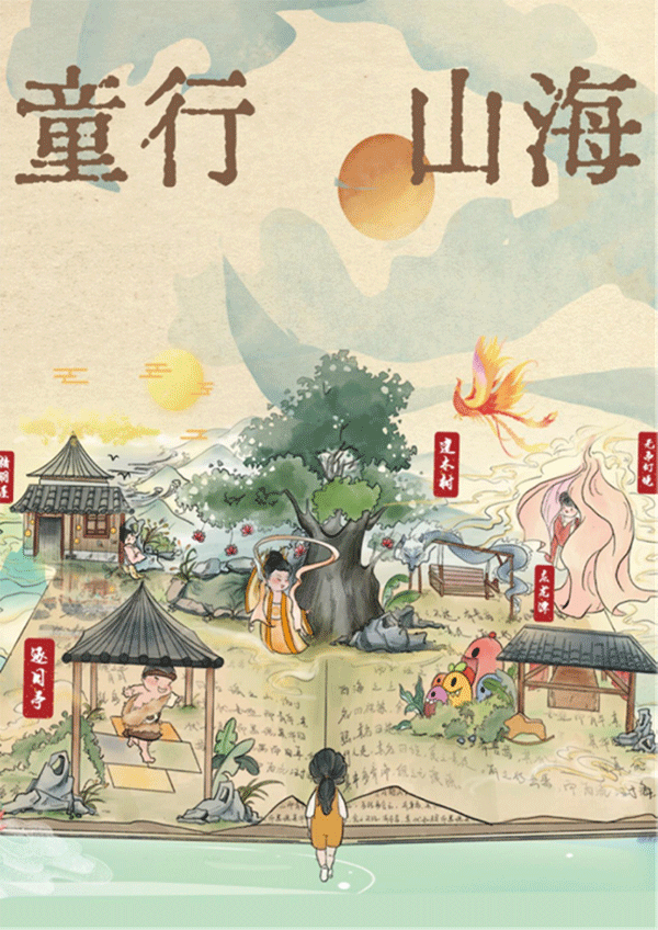 行进式沉浸神话剧《山海经·童行山海》,讲述了小学生阿上在翻阅父母的山海经研究笔记时,穿越到山海经的神话世界中的故事。在山海世界中,阿上结识了女娲、夸父、羽舒、精卫、白泽等守护神,并与落魄摆烂神水客一同历险与成长,最后收获了守护神与爱。在山海世界与现实世界中都感受到陪伴。
