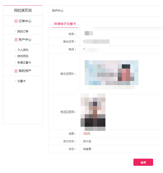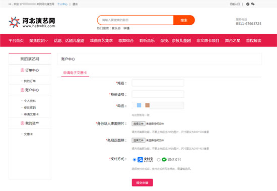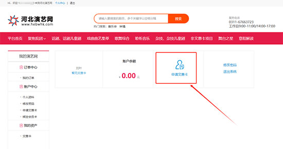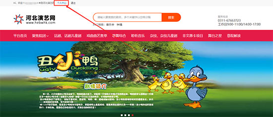 1.进入河北演艺网“www.hebwhk.com”首页,登录账号,点击【个人中心】进入“我的演艺网”页面。