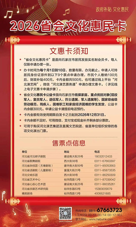 别再犹豫,现在就去申请你的2026省会文化惠民卡吧!让我们一起用行动支持城市文化建设,让生活因艺术而更加精彩,也让每个人都成为美好时代的参与者和见证者。扫描下方二维码关注公众号。
